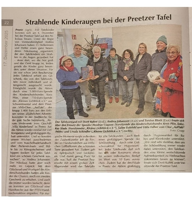 Die Leser der Kieler Nachrichten spendeten im Rahmen der KN-Hilfsaktion  "Gutes Tun im Advent"  4262,86 Euro für die Tafel in Preetz.